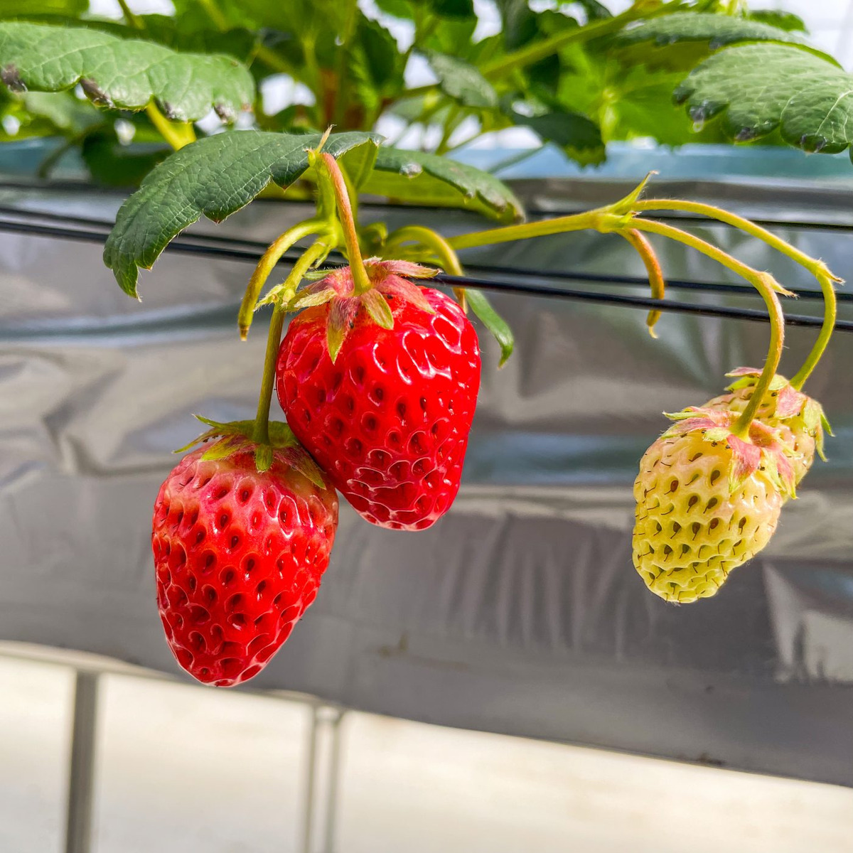 一歩ハウスへ足を踏み入れれば、甘酸っぱいいちごの香りに包まれ、目の前にはツヤツヤと輝く真っ赤ないちごがずらりと並びます。こちらでは、最新の栽培技術を駆使して…